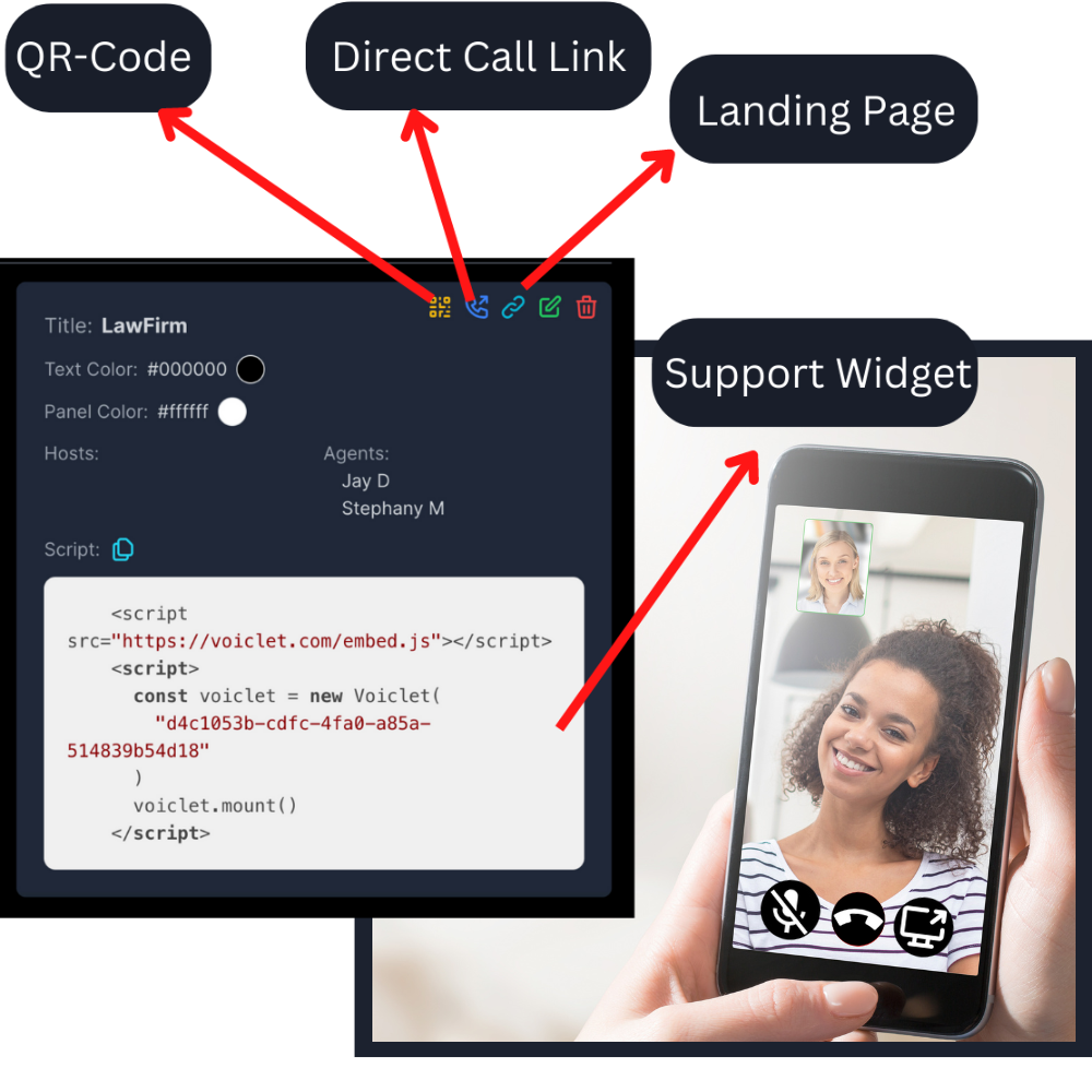 In addition to 'magic video links', create special widgets that embed anywhere page visitors can click to open up an HD video call or phone call with an agent fast and easily.