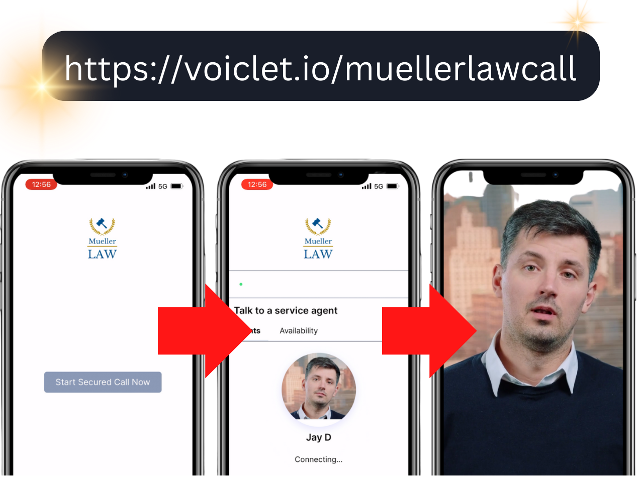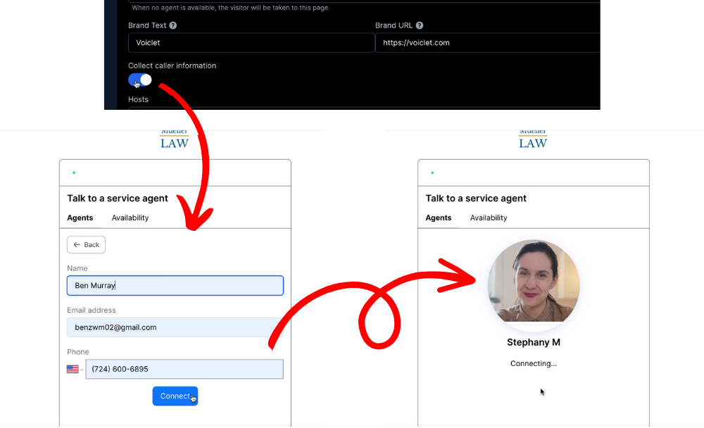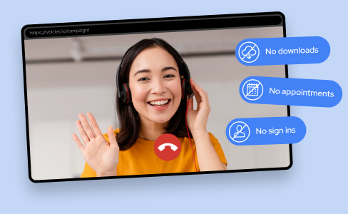 Video or voice calls can start instantly, or require the prospect to enter their email and/or phone number before connecting.